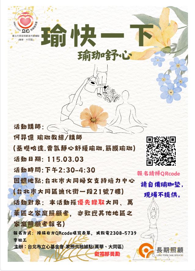 對象: 以萬華、大同區照顧者優先,亦歡迎其他區照顧者報名。